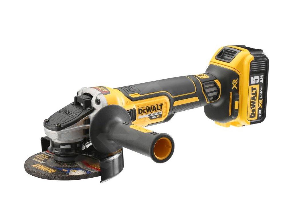 DeWALT DCG405P3-QW aku – kotni brusilnik XR (18V/3×5,0Ah/125mm). Brusilniku so priložene 3 baterije 5,0 ah, polnilec in kovček. Brusilnik ima brezkrtačni motor.